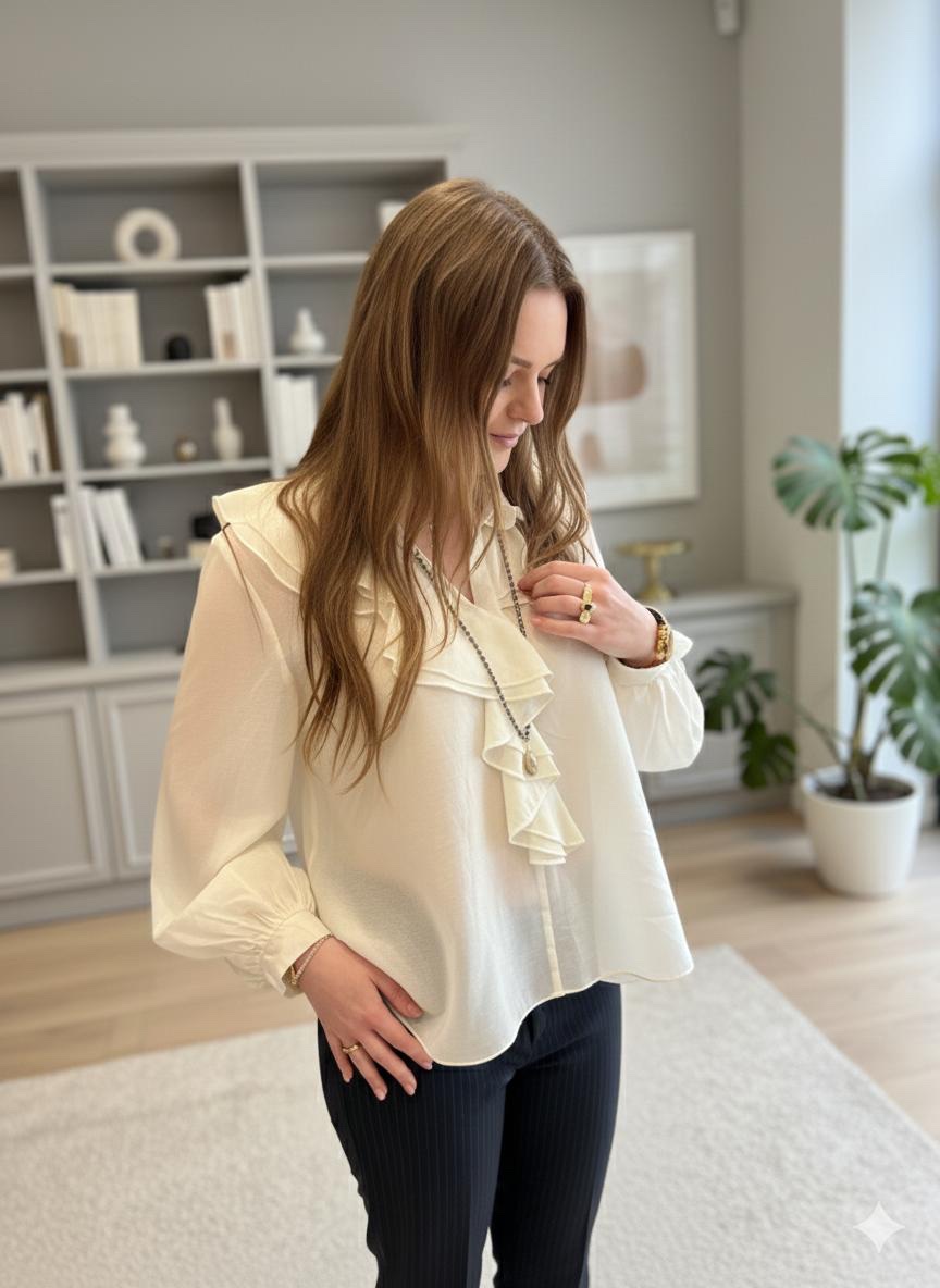Cette élégante blouse blanc se distingue par son col en V agrémenté de volants fluides qui apportent une touche romantique et vaporeuse à votre tenue. Sa coupe ample et ses manches délicatement resserrées aux poignets offrent un style à la fois chic et décontracté, idéal pour toutes les occasions. Confectionnée dans une matière légère, elle assure un confort optimal tout au long de la journée.