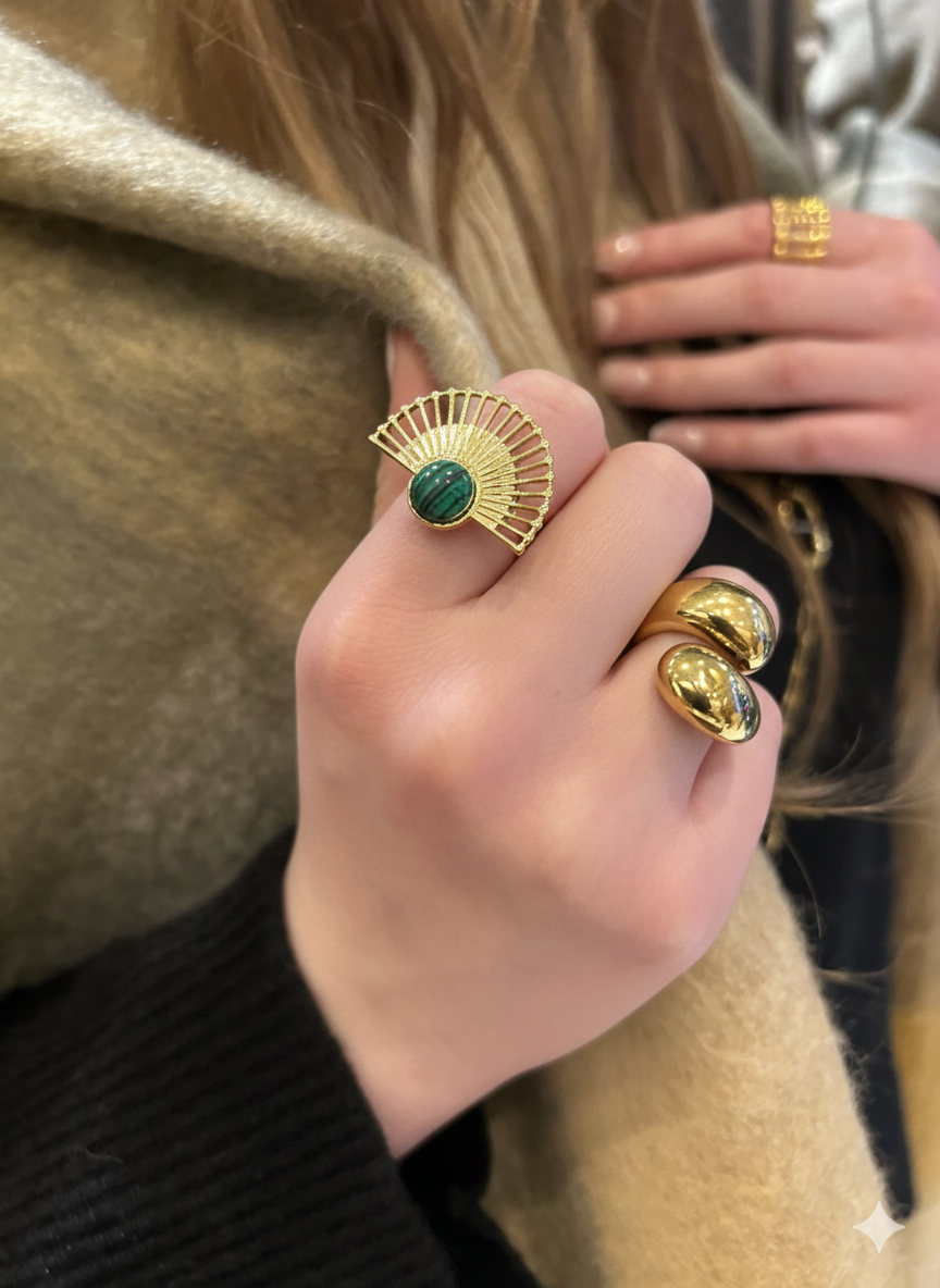 Bague solaire dorée, au design contemporain, ornée d’une pierre verte cabochon. Élégante et originale, elle apporte une touche lumineuse et moderne à toutes vos tenues.