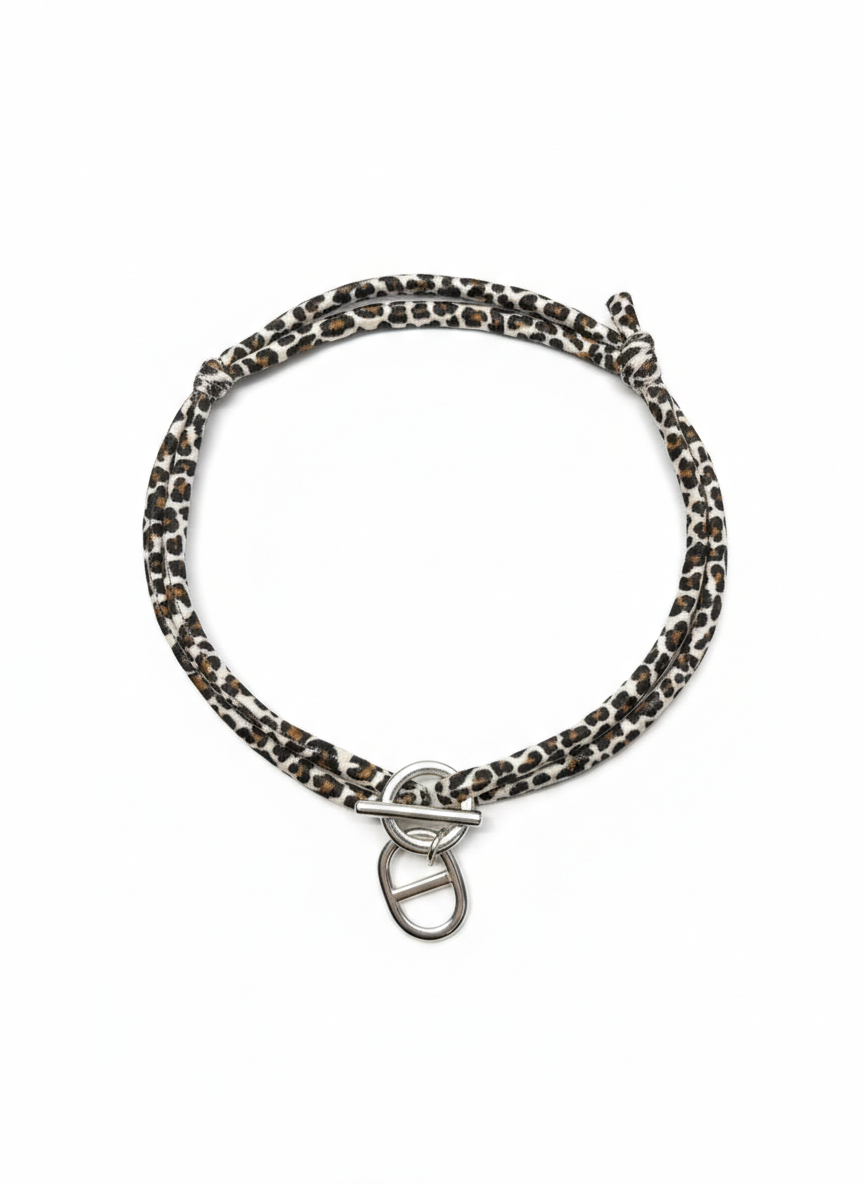 Ce collier original joue sur la superposition avec ses deux rangs de cordons souples Ă imprimĂ© lĂ©opard. Son design minimaliste est rehaussĂ© par un fermoir marine en mĂ©tal argentĂ©, composĂ© d’un anneau et d’une barre (T-bar), auxquels est suspendu un Ă©lĂ©gant maillon assorti. Ce mĂ©lange entre l’esthĂ©tique et les touches de lĂ©opard crĂ©e un bijou moderne et dynamique. Confortable et lĂ©ger, c’est l’accessoire idĂ©al pour donner du relief Ă un col roulĂ© noir ou une chemise blanche avec une Ă©lĂ©gance dĂ©contractĂ©e.
