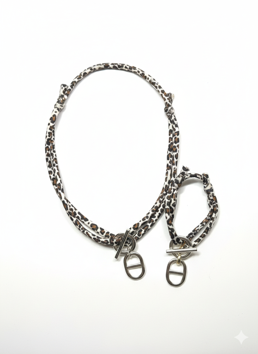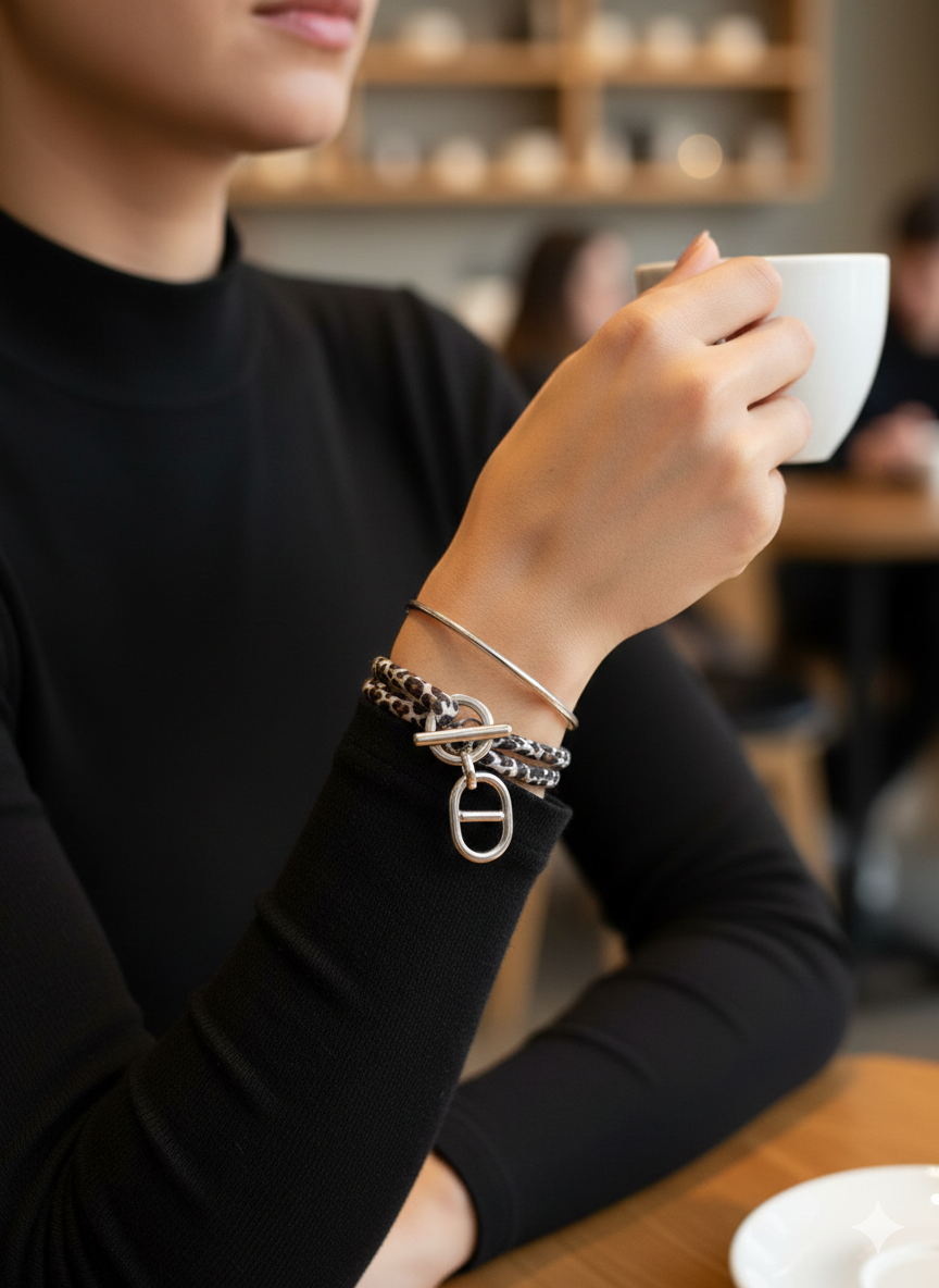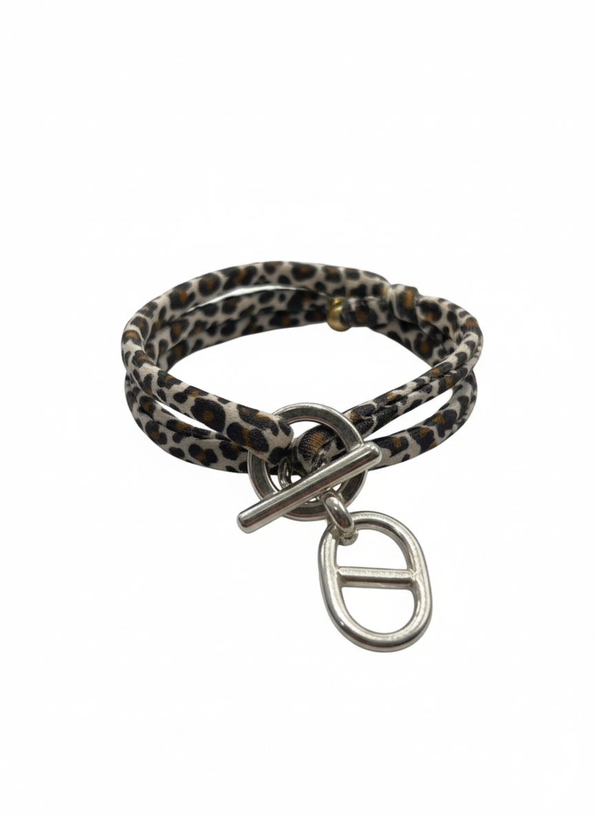 Ce bracelet original se compose de deux rangs de cordons souples, rĂ©glable, ornĂ©s d’un imprimĂ© lĂ©opard intemporel. Sa piĂšce maĂźtresse est un fermoir marine en mĂ©tal argentĂ©, composĂ© d’un anneau et d’une barre (fermoir T-bar). Ce mĂ©lange de textures et de styles entre le chic urbain du motif et l’aspect graphique du mĂ©tal en fait un accessoire de caractĂšre qui se porte aussi bien seul qu’en accumulation. Un bijou moderne et facile Ă porter pour pimenter votre look quotidien.