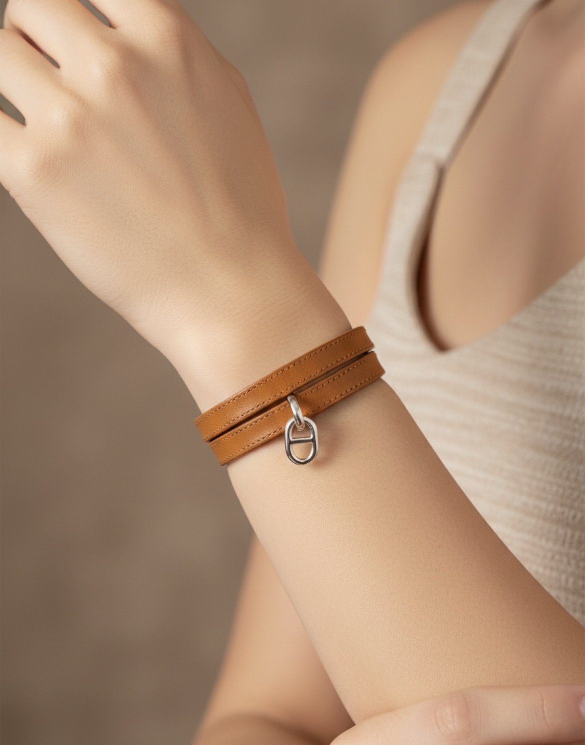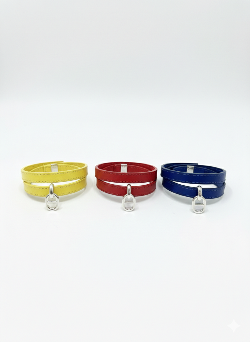 Bracelet cuir réglable couleur orange mandarine, 3 tours, breloque: maille marine