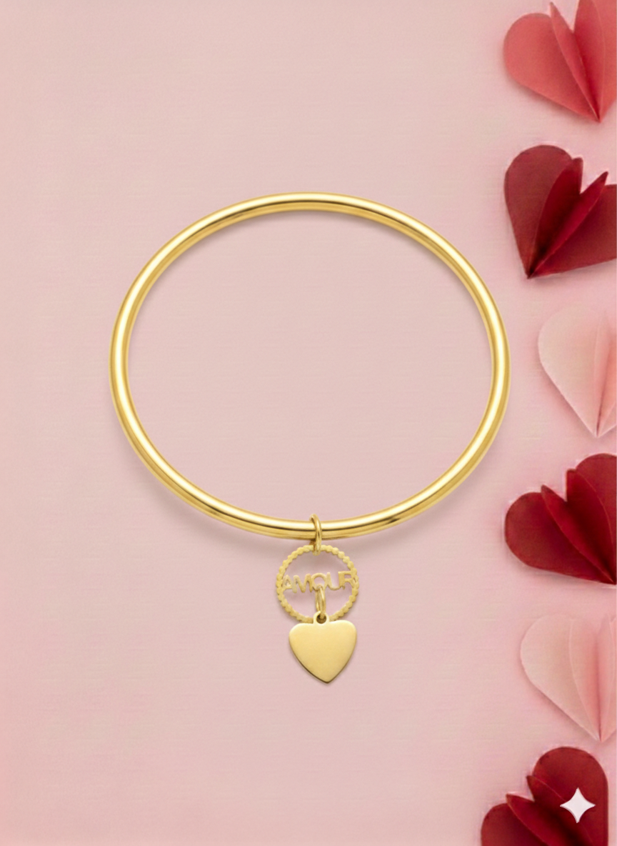 Laissez-vous charmer par ce jonc au style épuré et poétique qui marie la pureté de l’or à un message de tendresse universel. La pièce maîtresse, une médaille finement ajourée du mot « AMOUR », s’accompagne d’un petit cÅ“ur lisse suspendu, véritable symbole d’affection et de délicatesse pour cette création.
