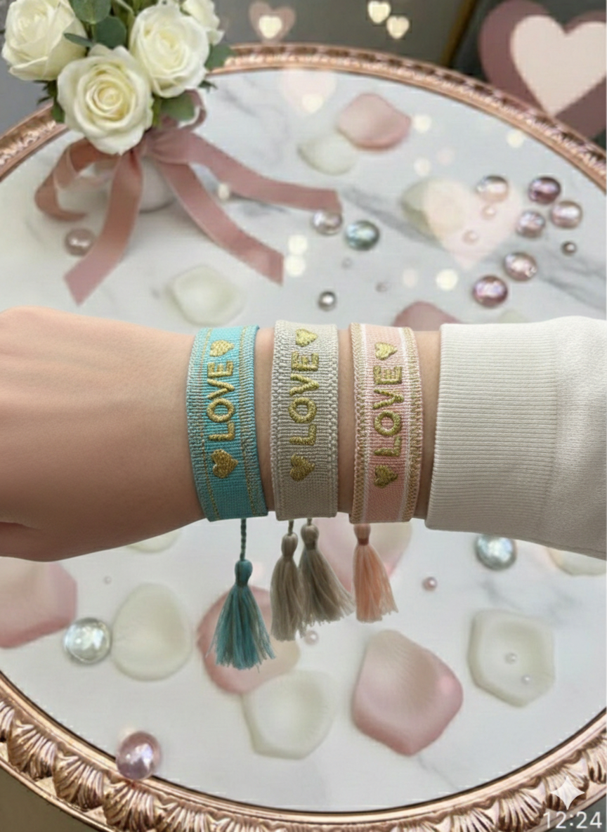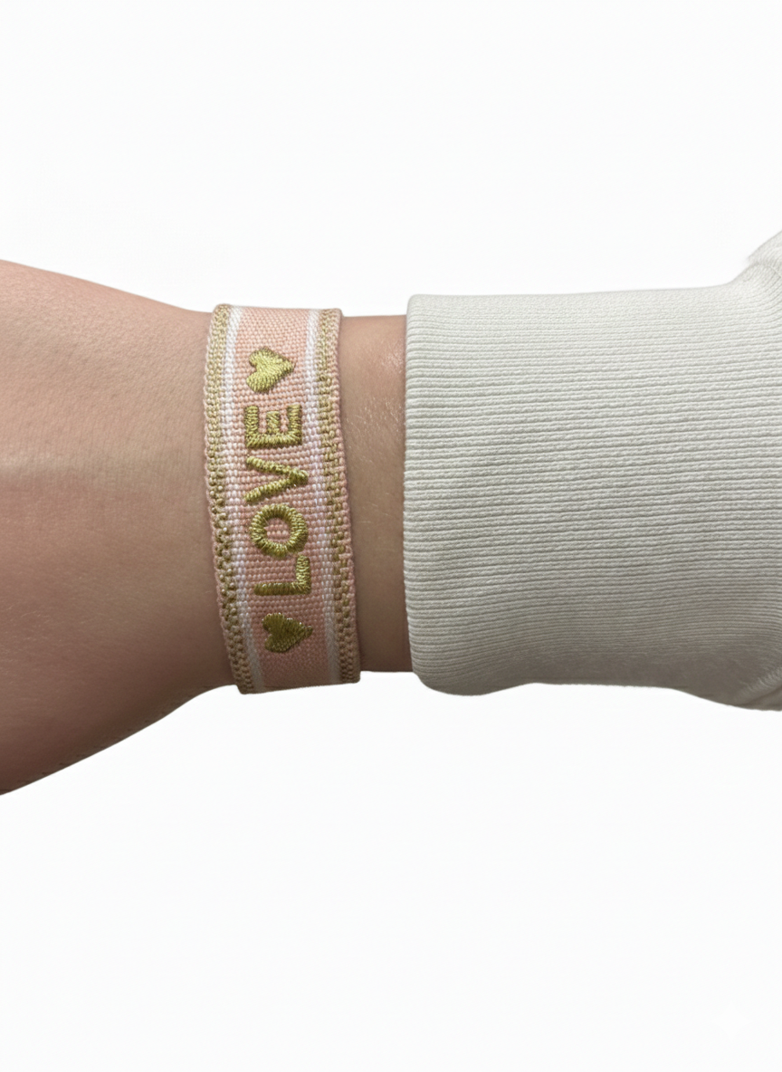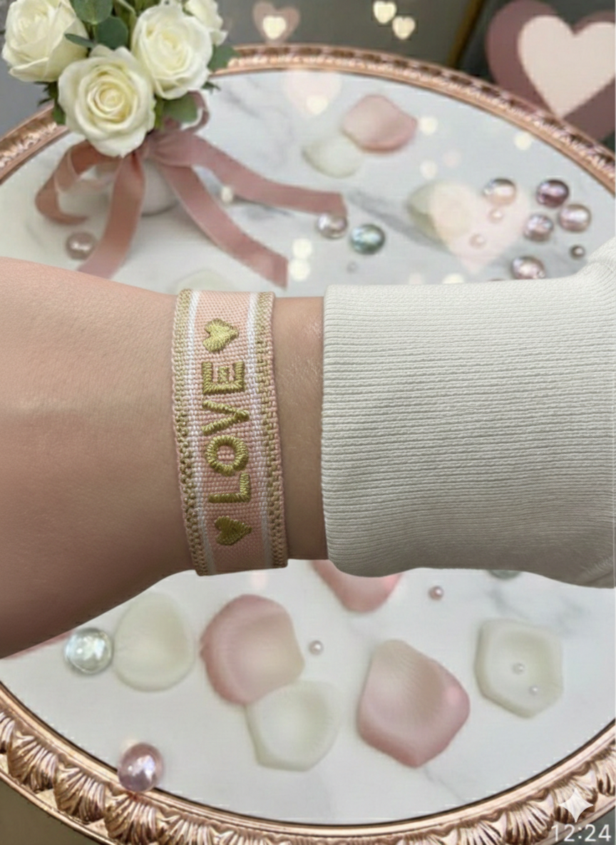 Laissez-vous sĂ©duire par ce bracelet qui joue sur une harmonie de rose poudrĂ© et de broderies dorĂ©es. Le message « LOVE » ressort avec douceur au centre du bandeau, entourĂ© de deux petits cĆurs scintillants pour un style Ă la fois romantique et tendance.