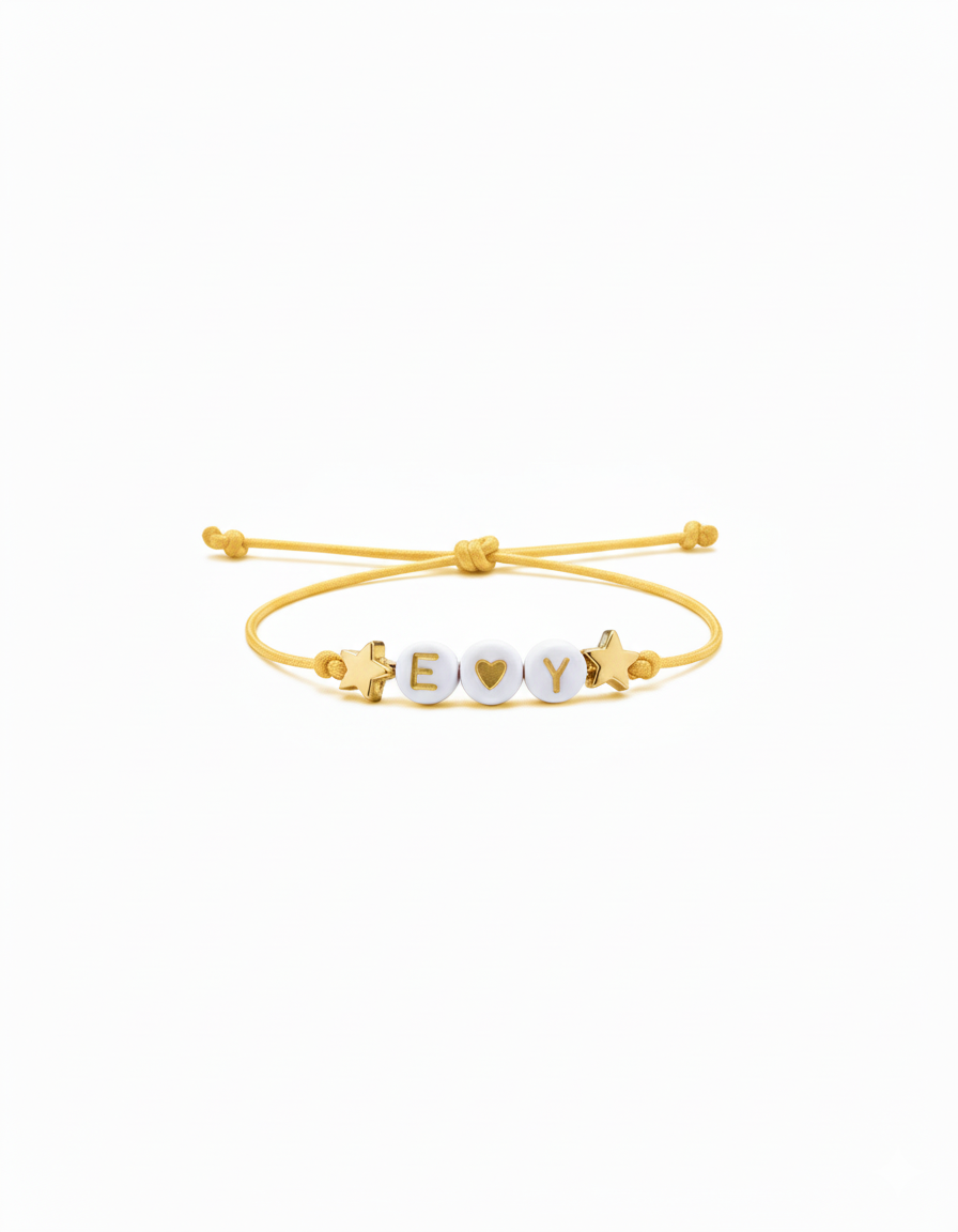 Bracelet message élastique doré coulissant initiales au choix, fait mains, composé de perles alphabets acrylique, et perle métal.