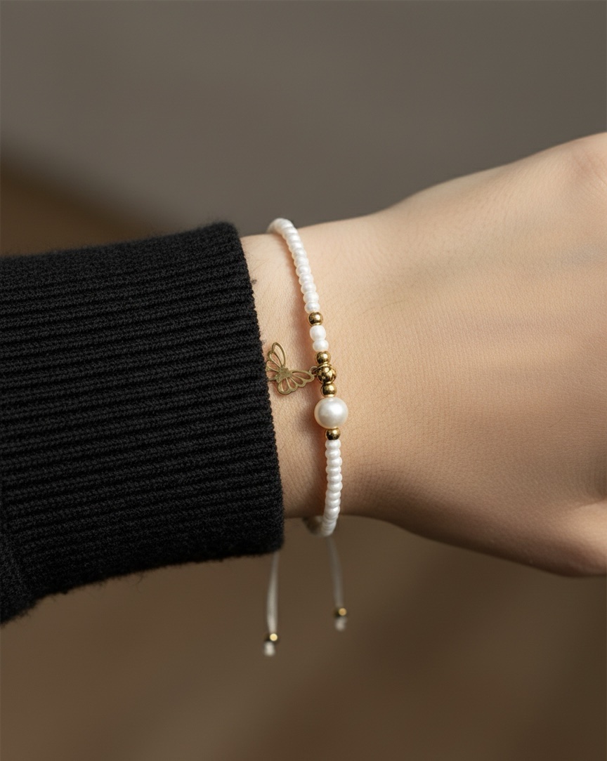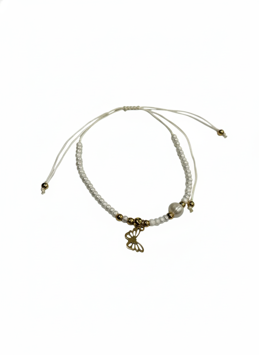 Bracelet papillon perles blanches et dorée