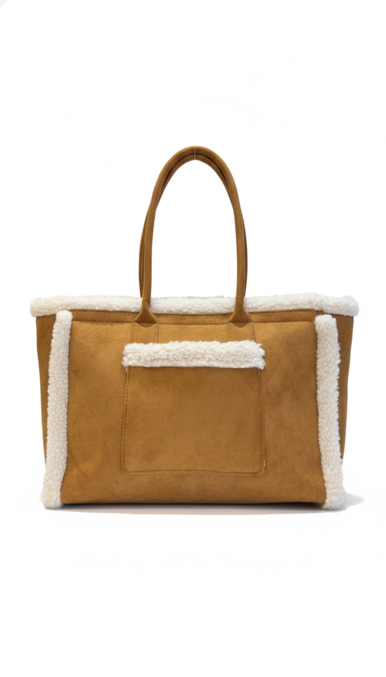Sac cabas en suédine, rehaussé de détails bouclette dans de jolis tons camel. Porté épaule, pratique avec sa fermeture zippée, il est aussi stylé que fonctionnel. à porter sans modération.