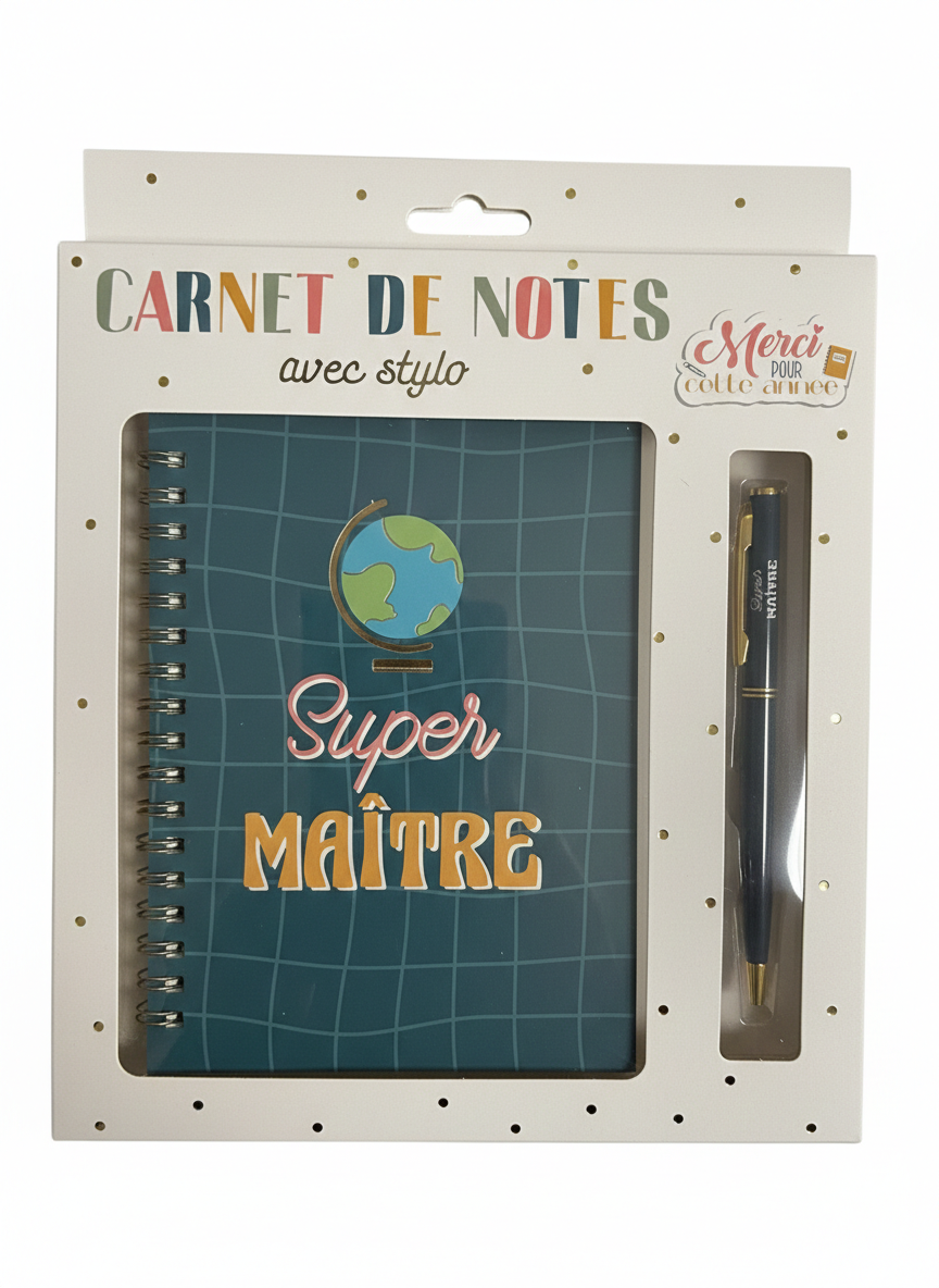 Le carnet arbore une couleur bleu canard tendance avec un motif quadrillé, joliment illustré d’un globe terrestre et du message valorisant “Super MAÎTRE”. Présenté dans un emballage soigné parsemé de pois dorés et portant la mention “Merci pour cette année”, ce duo est prêt à être offert pour marquer les esprits. C’est l’accessoire de bureau parfait, alliant utilité quotidienne et souvenir affectueux.