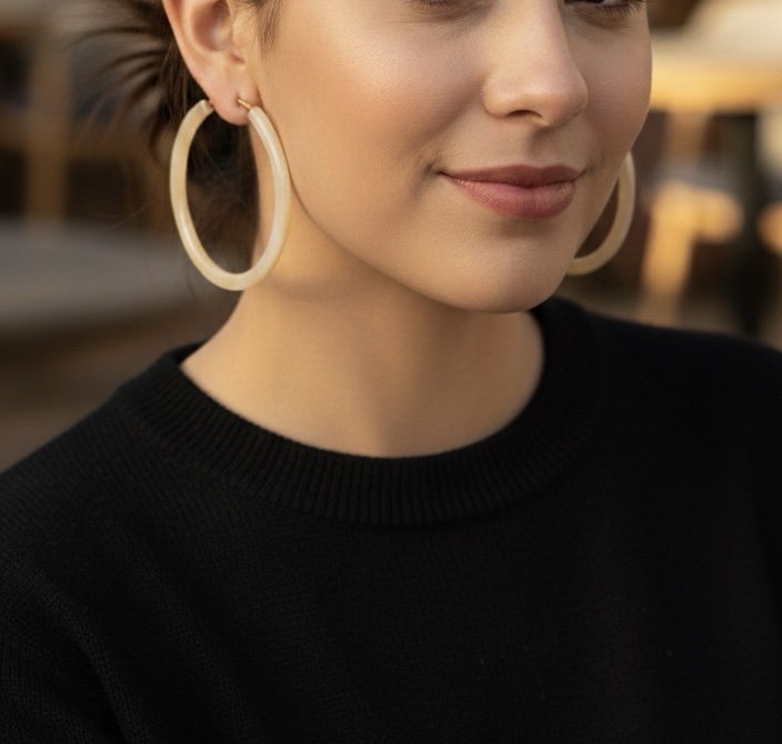 Sublimez votre style avec ces créoles élégantes en corne naturelle. Chaque paire est unique grâce aux nuances organiques et aux variations naturelles de la corne, qui apportent un charme authentique et intemporel à vos accessoires.