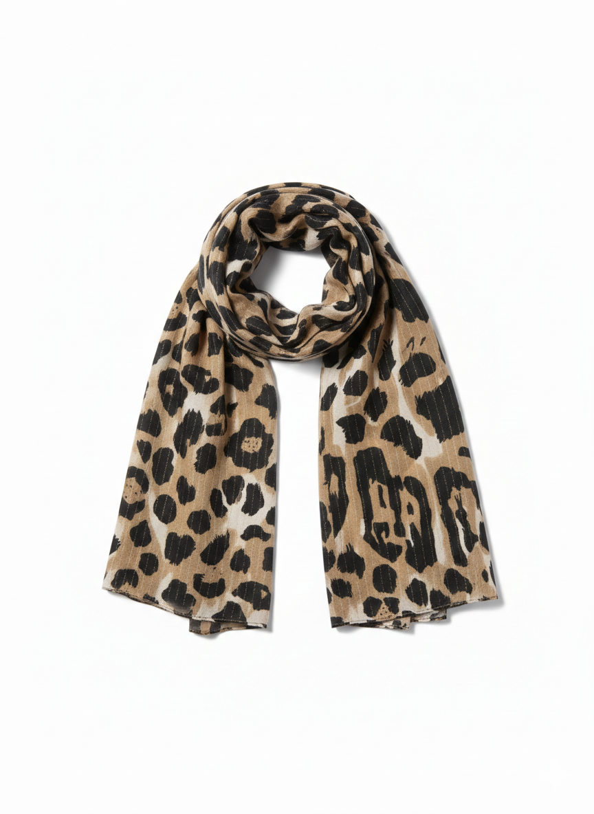 Cette écharpe arbore un motif léopard intemporel qui apporte instantanément une touche d’audace et d’élégance à votre silhouette. Sa matière fluide et légère permet un drapé souple pour un confort optimal en toute saison. Le design est complété par de discrètes bordures rayées pour un rendu moderne. Cet accessoire polyvalent est idéal pour rehausser un look décontracté ou pour accessoiriser une tenue plus sobre avec caractère.