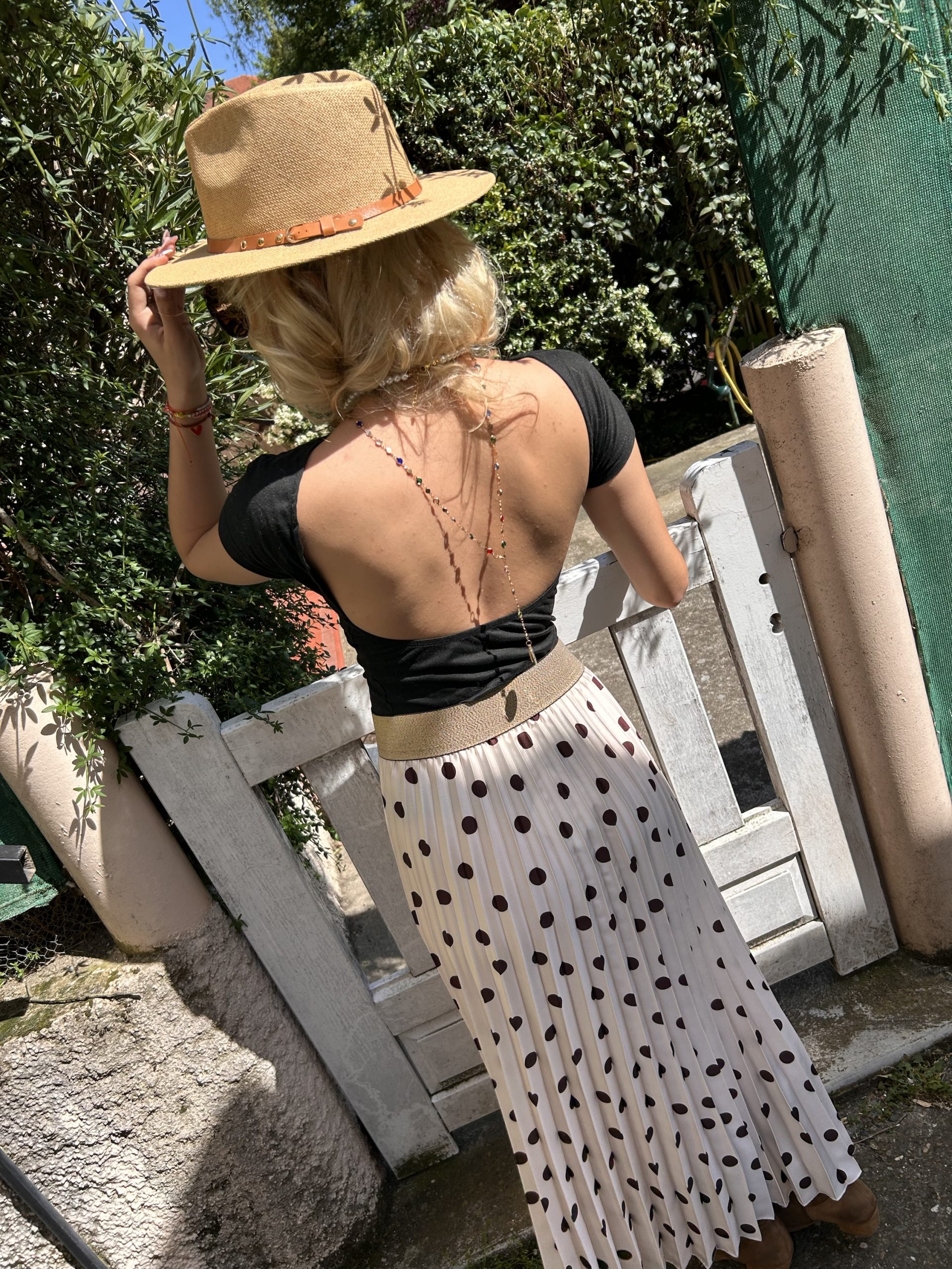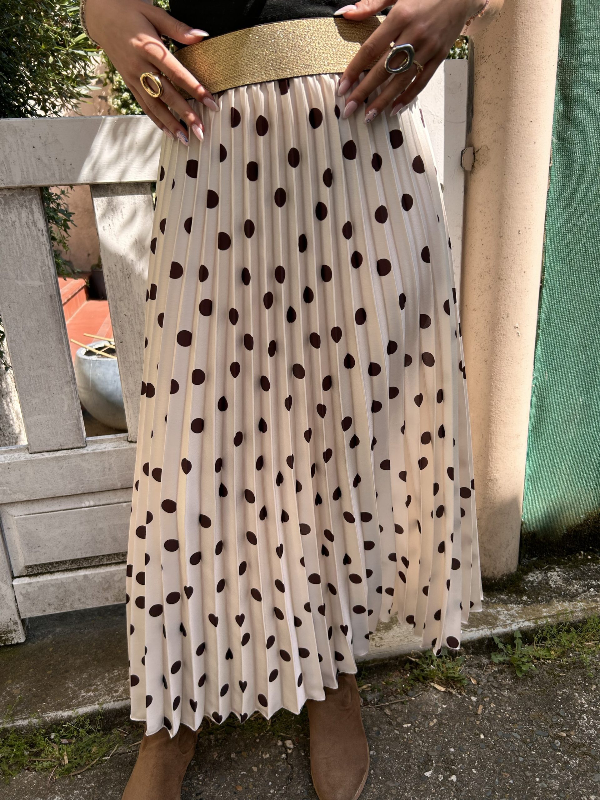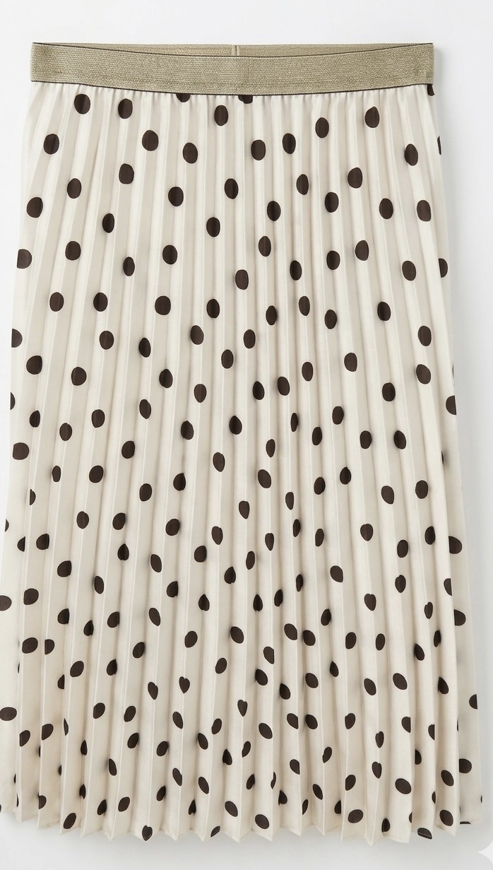 Jupe plissée beige à pois ton sur ton, sublimée par une délicate ceinture dorée ✨