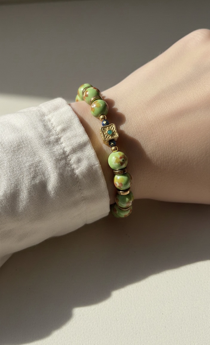 Ce bracelet se compose d’une harmonie de perles vert pomme délicatement décorées de motifs floraux rouges et blancs, évoquant la fraîcheur d’un jardin. Des intercalaires dorés et des perles de cristal bleu nuit facettées encadrent une pièce centrale remarquable : un cartouche doré ciselé serti d’une pierre d’un vert émeraude profond. Ce bijou combine un charme vintage avec une esthétique naturelle et lumineuse, idéal pour apporter une touche de couleur fraîche et sophistiquée à votre poignet.