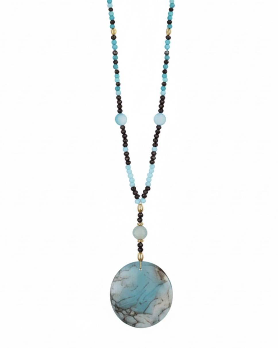 Ce magnifique sautoir allie l’élégance bohème à la beauté des pierres naturelles à travers un travail d’enfilage raffiné. Sa longue chaîne alterne avec rythme des perles turquoise vibrant, des touches noires profondes et de délicats éclats dorés qui illuminent l’ensemble. La pièce maîtresse est un majestueux pendentif circulaire en pierre marbrée, dont les nuances azur et terreuses rendent chaque exemplaire unique. Suspendu avec grâce, ce médaillon apporte une présence sculpturale et authentique, idéale pour sublimer un décolleté avec une touche d’évasion sophistiquée.