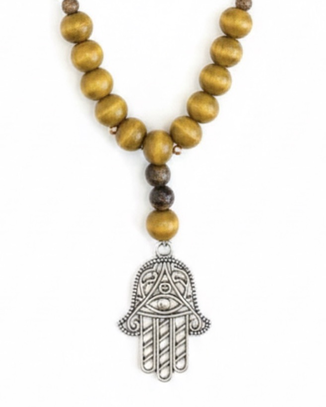 Ce collier d’inspiration spirituelle se distingue par son mélange chaleureux de matières naturelles et de symboles protecteurs. Sa chaîne est composée d’un assemblage éclectique de perles en bois aux tons ocre et moutarde, ponctuées de pierres aux nuances terreuses, de touches de turquoise et de disques métalliques. Cette variété de textures et de couleurs crée un rythme organique et authentique le long du bijou. En son centre trône un imposant pendentif en métal argenté représentant la Main de Fatma, minutieusement ciselée avec un Å“il central pour symboliser la protection. C’est un accessoire chargé d’histoire et de caractère, parfait pour apporter une touche bohème et mystique à une tenue sobre.