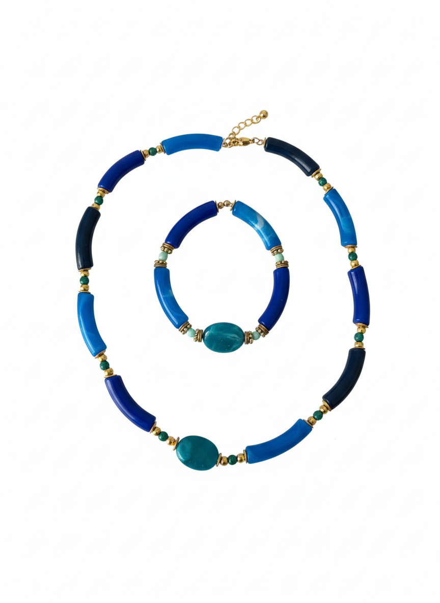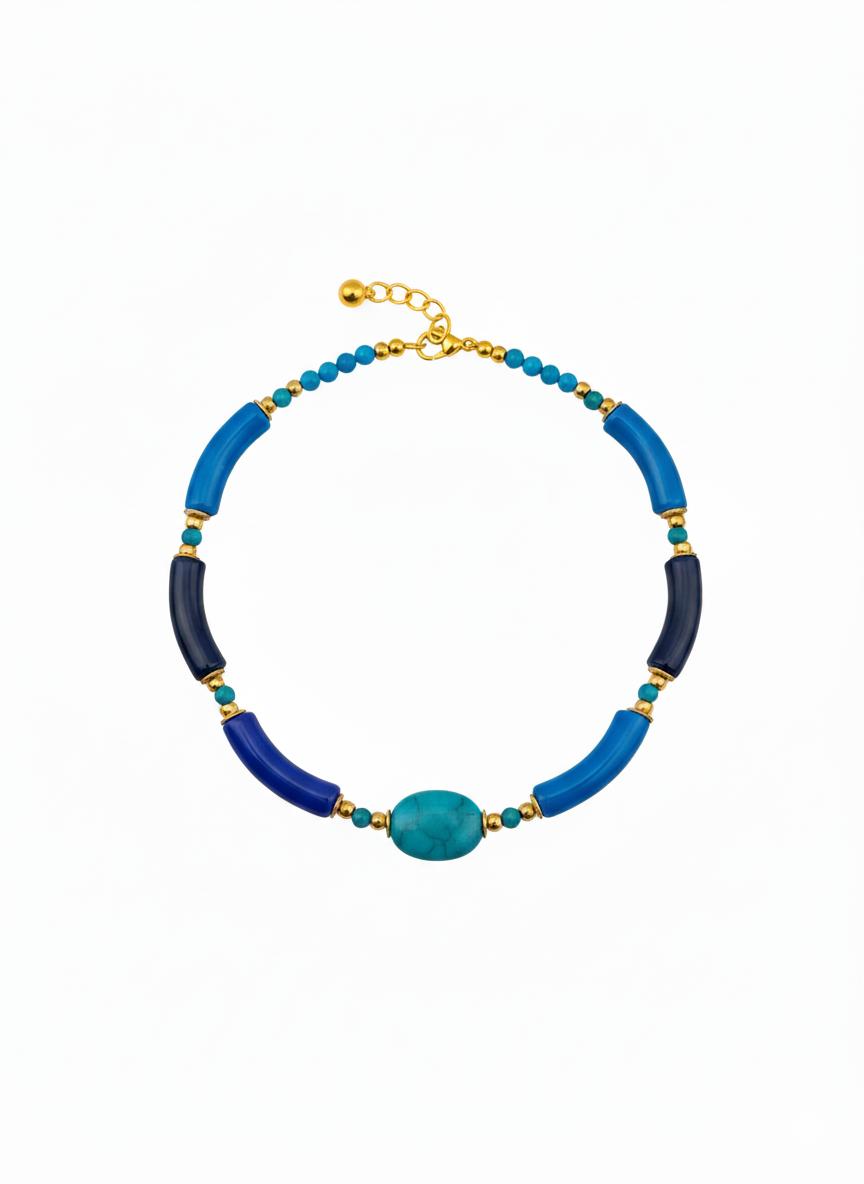 Ce collier ras-du-cou célèbre l’intensité des teintes aquatiques à travers un design à la fois structuré et élégant. Il se compose d’une alternance de tubes incurvés déclinés dans un dégradé de bleus, allant du marine profond à l’azur éclatant, créant un rythme visuel captivant. Ces éléments sont reliés par de petites perles dorées qui soulignent la courbe du bijou avec une touche de lumière précieuse. En son centre, une pierre ovale turquoise marbrée apporte une note organique et authentique, rappelant la beauté des rivages lointains. Ce mariage de textures lisses et de pierres naturelles fait de ce choker un accessoire de caractère, idéal pour sublimer un décolleté avec une sophistication moderne et solaire.