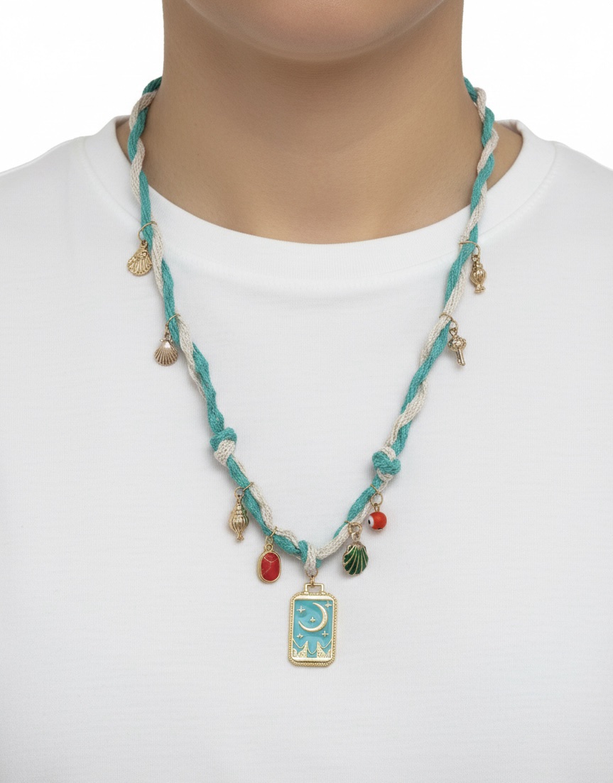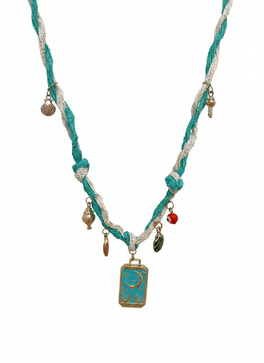 Ce collier ras-du-cou artisanal invite à l’évasion avec son cordon tressé bicolore, mêlant un blanc crème pur à un turquoise profond évoquant les reflets de l’océan. Le design est enrichi d’une multitude de pampilles délicates qui racontent une histoire : des coquillages argentés et dorés rappellent la plage, tandis qu’une perle “œil” protectrice rouge apporte une touche de couleur vive. La pièce maîtresse est un médaillon rectangulaire émaillé d’un bleu azur, orné d’un croissant de lune et d’étoiles dorées, tel un talisman céleste suspendu au cou. Ce mélange de textures et de symboles fait de ce bijou un accessoire unique et plein de charme, parfait pour sublimer un look bohème avec une élégance mystique.