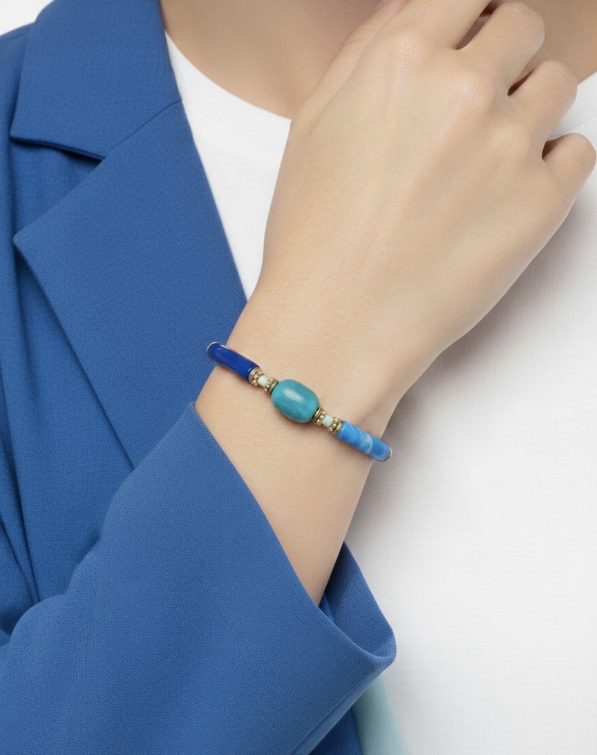 Ce bracelet jonc élastiqué est une pièce audacieuse qui capture l’essence des lagons tropicaux. Il est composé de larges segments incurvés en résine, alternant entre un bleu marine uni et un bleu azur magnifiquement marbré de blanc. Ces éléments tubulaires sont séparés par de délicats anneaux dorés striés et de petites perles d’un vert menthe tendre, créant un rythme visuel sophistiqué. Au centre, une pierre ovale d’un bleu turquoise profond sert de point focal, affirmant le caractère organique et luxueux du bijou. Grâce à son montage extensible, il s’adapte confortablement au poignet tout en apportant une touche de couleur vibrante et une élégance moderne à votre parure.