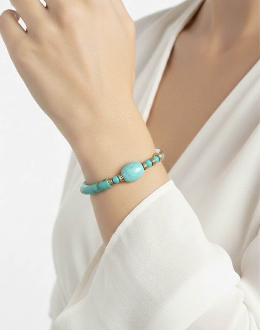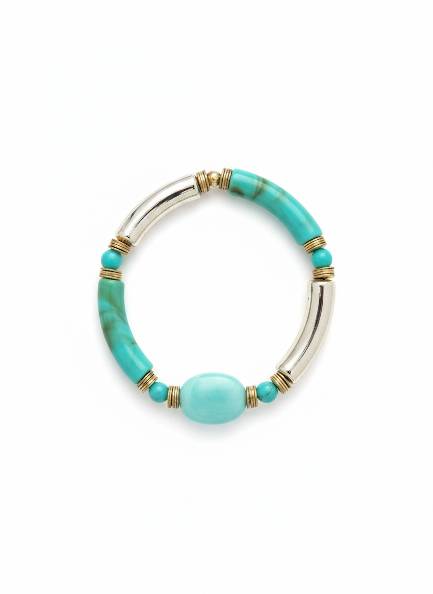 Ce bracelet jonc extensible se distingue par son allure fraîche et contemporaine, idéale pour illuminer le poignet. Il alterne avec soin des segments tubulaires d’un turquoise marbré, évoquant la clarté des eaux tropicales, et des tubes en métal argenté à la finition miroir. Ces éléments sont harmonieusement séparés par des disques argentés ciselés et de petites perles turquoise coordonnées, créant un rythme visuel équilibré et raffiné. Au centre, une pierre ovale lisse d’un bleu turquoise pur sert de point focal, ajoutant une touche organique à ce design structuré. Léger et facile à enfiler, ce bracelet apporte une note de sophistication sereine à n’importe quelle tenue, qu’elle soit décontractée ou plus habillée.