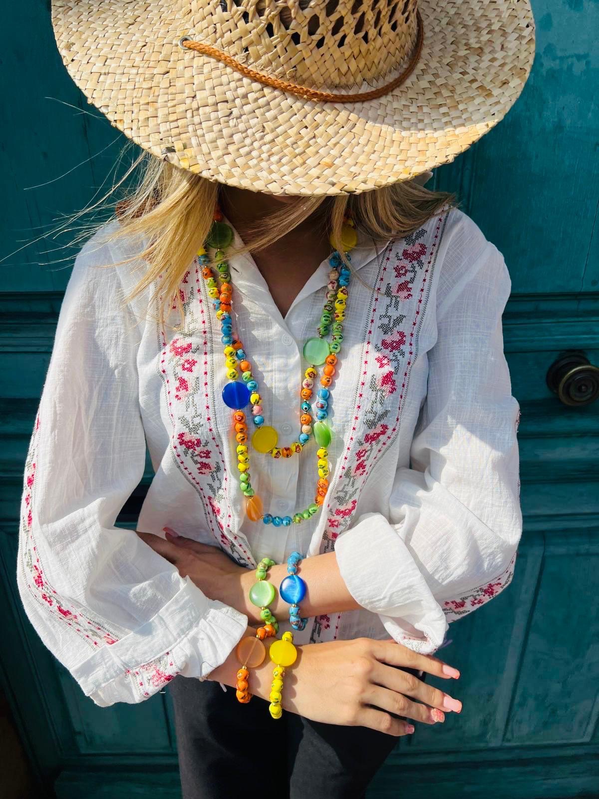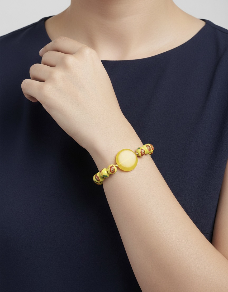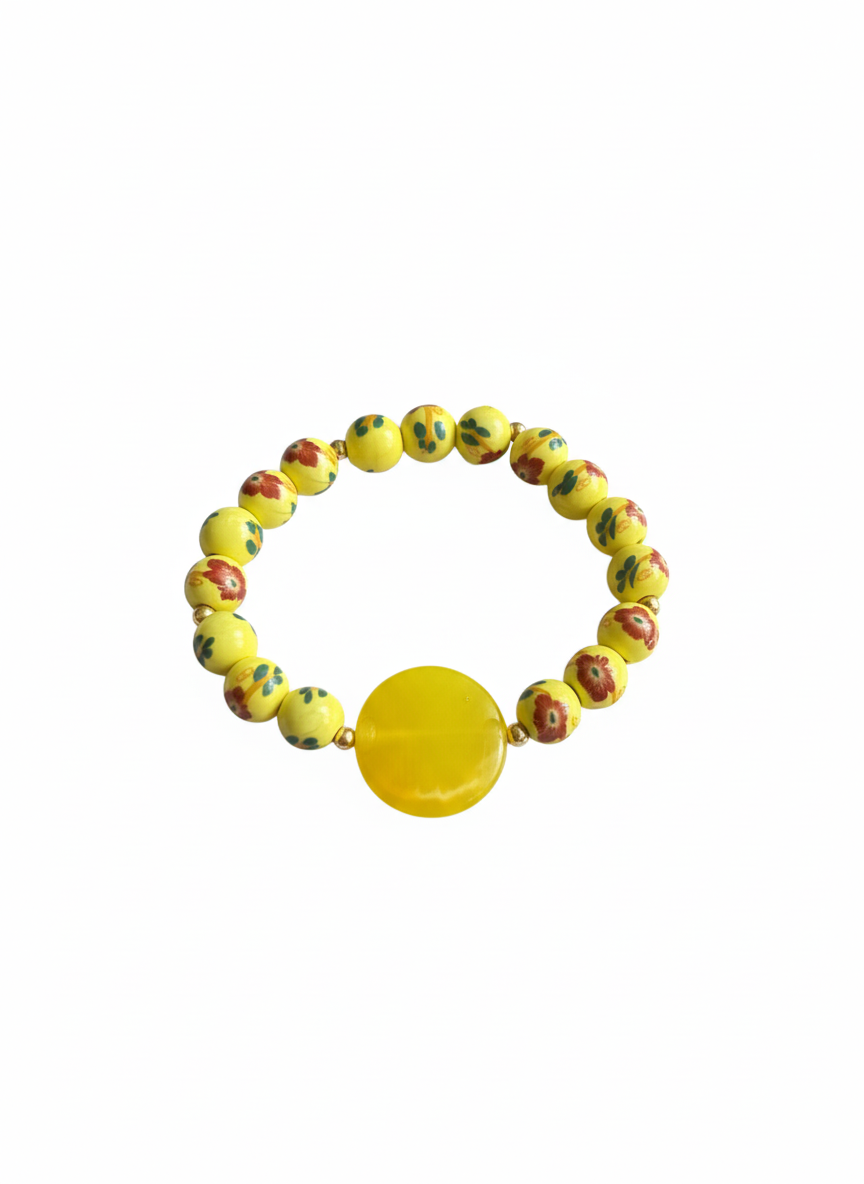 Ce ravissant bracelet Ă©lastiquĂ© est une vĂ©ritable ode au printemps et Ă la lumiĂšre. Il est composĂ© d’une succession de perles sphĂ©riques d’un jaune citron Ă©clatant, ornĂ©es de dĂ©licats motifs floraux peints Ă la main dans des tons rouges et verts, Ă©voquant le charme des jardins en fleurs. Au centre du bijou trĂŽne une large perle plate et circulaire en rĂ©sine translucide d’un jaune d’or intense, qui capte et diffuse la lumiĂšre avec douceur. De petites perles dorĂ©es servent d’intercalaires, ajoutant une touche de prĂ©ciositĂ© Ă l’ensemble. LĂ©ger, joyeux et facile Ă porter, ce bracelet est l’accessoire parfait pour apporter une note de fantaisie et de chaleur Ă votre poignet, seul ou associĂ© Ă d’autres joncs de la collection.