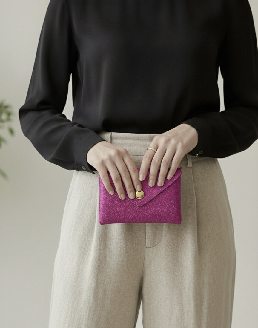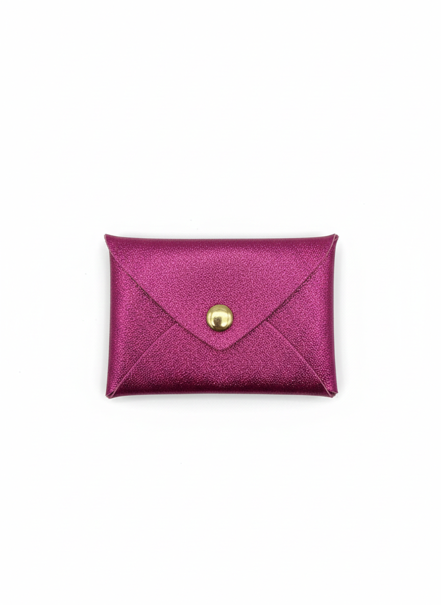 Cet élégant petit accessoire se distingue par sa finition irisée d’un rose fuchsia intense, apportant une touche de brillance sophistiquée et moderne à votre quotidien. Son design minimaliste en forme d’enveloppe est complété par un rabat triangulaire sécurisé par un bouton-pression doré soigneusement centré, garantissant la protection de vos cartes ou petits essentiels. Confectionnée dans une matière texturée aux reflets métalliques, cette pochette compacte se glisse facilement dans un sac à main ou peut être utilisée seule comme un petit accessoire de mode audacieux et féminin.