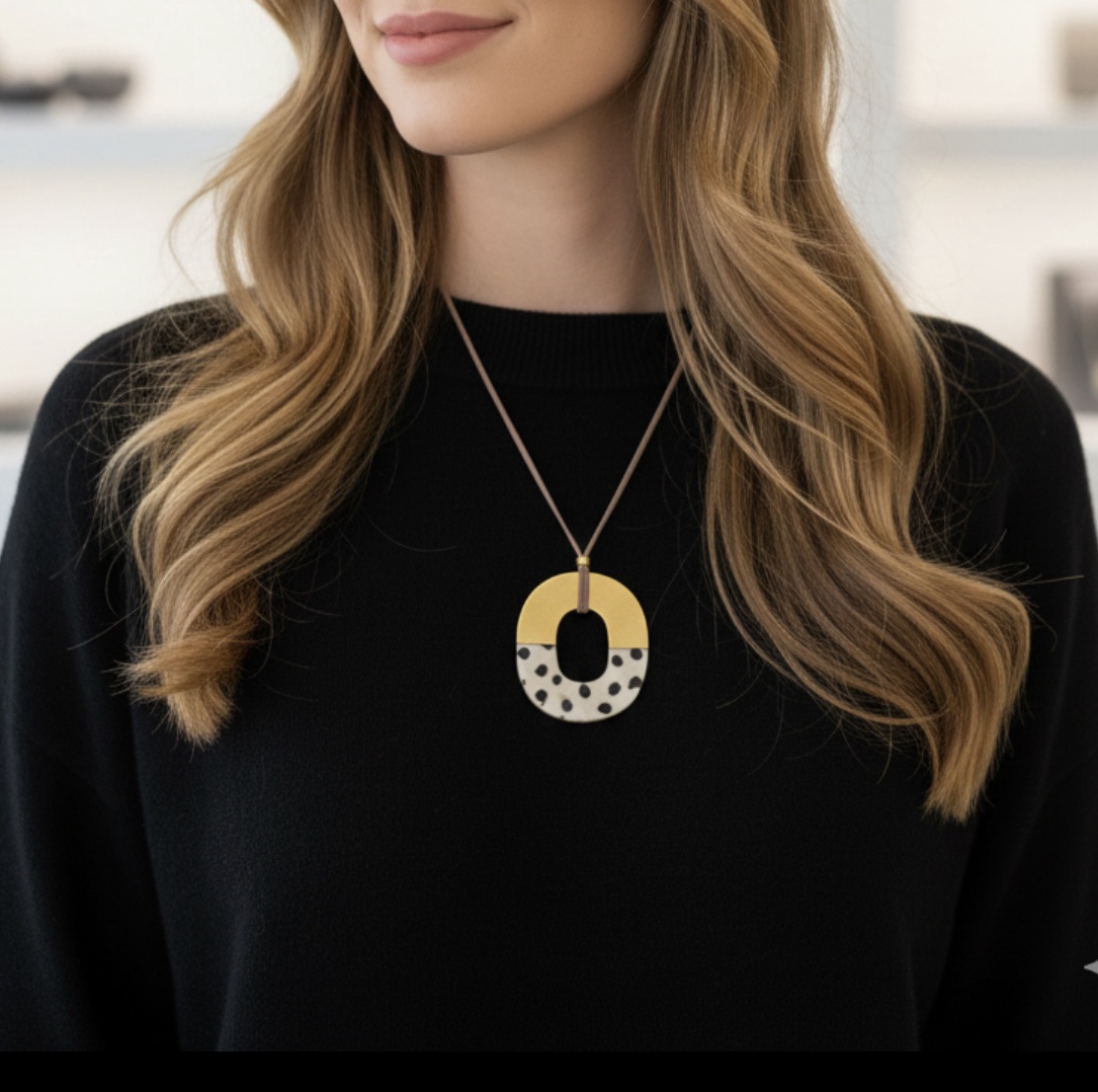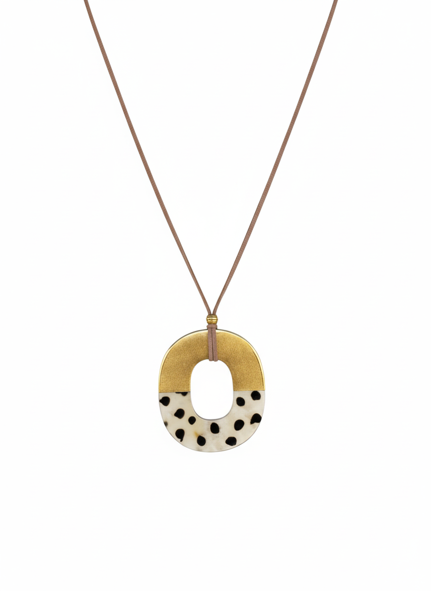 SautoirLeonie, sautoir en corne léopard Affirmez votre style avec ce collier léopard au caractère résolument chic. Ce sautoir en corne séduit par son pendentif bimatière, associant corne et laque dans un élégant imprimé léopard. À la fois tendance et intemporel, ce bijou léopard apporte une touche sophistiquée et audacieuse à toutes vos tenues. Facile à porter grâce à son cordon réglable, ce sautoir devient l’allié parfait pour sublimer une silhouette avec raffinement.